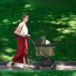 • EASY TO ASSEMBLE & FOLD – One-handed quick-fold lightweight aluminum frame (only 10lb) for easy storage and transportation, stand independently without PU leather handle touching the ground. One-foot brake can easily stop the dog stroller. With cup holder and X-Large capacity storage basket, easy to carry pet supplies and toys outdoors.