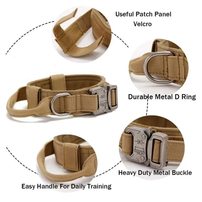 A control handle can grab your dog from the collar, makes it very easy when putting your dog in walking him to your lead. Have magic sitcker hold it for when not in use.There is an magic sticker ID panel on this tactical collar that can be placed for patches.